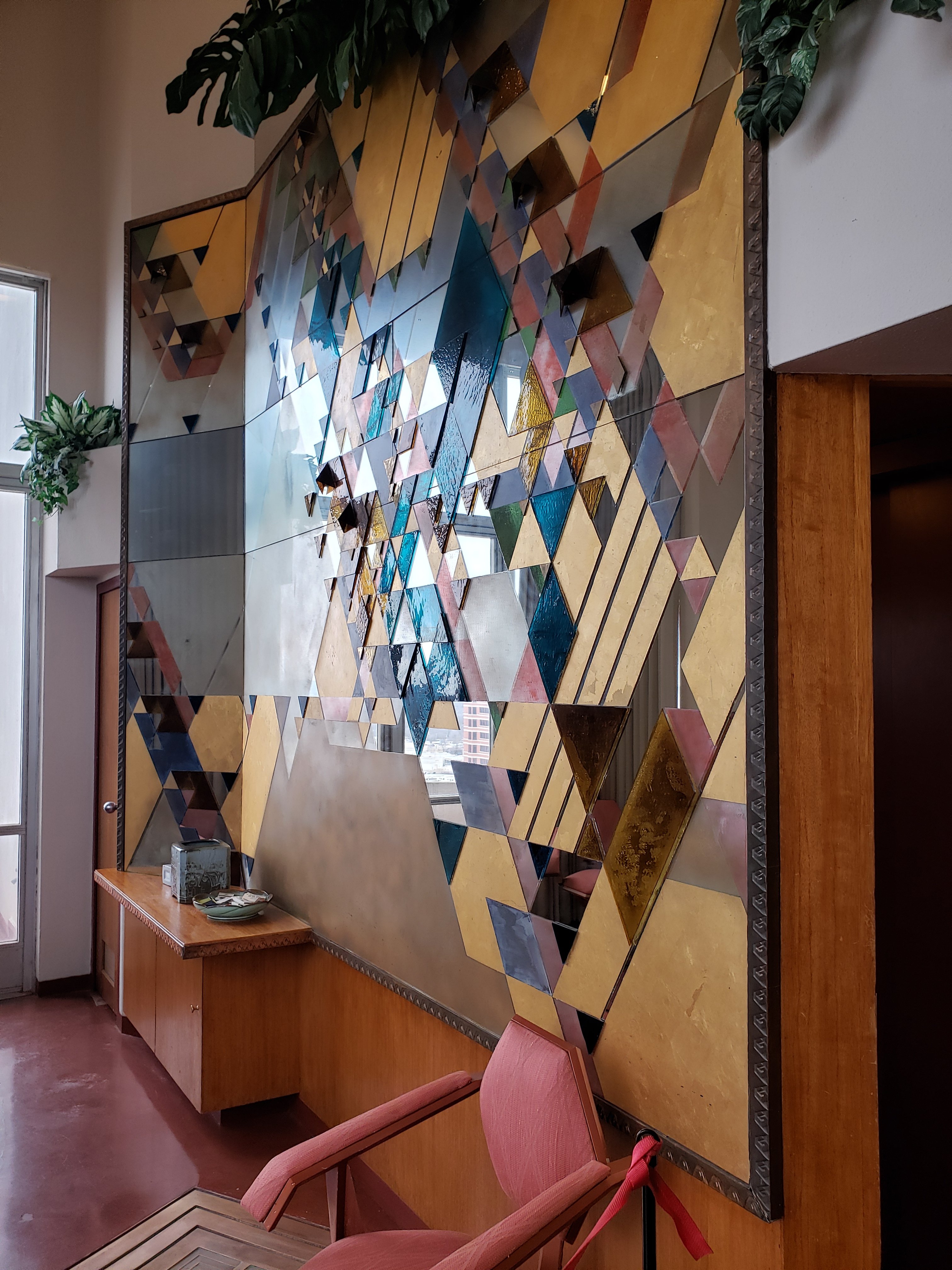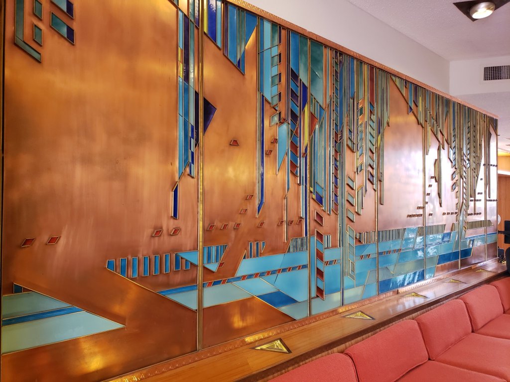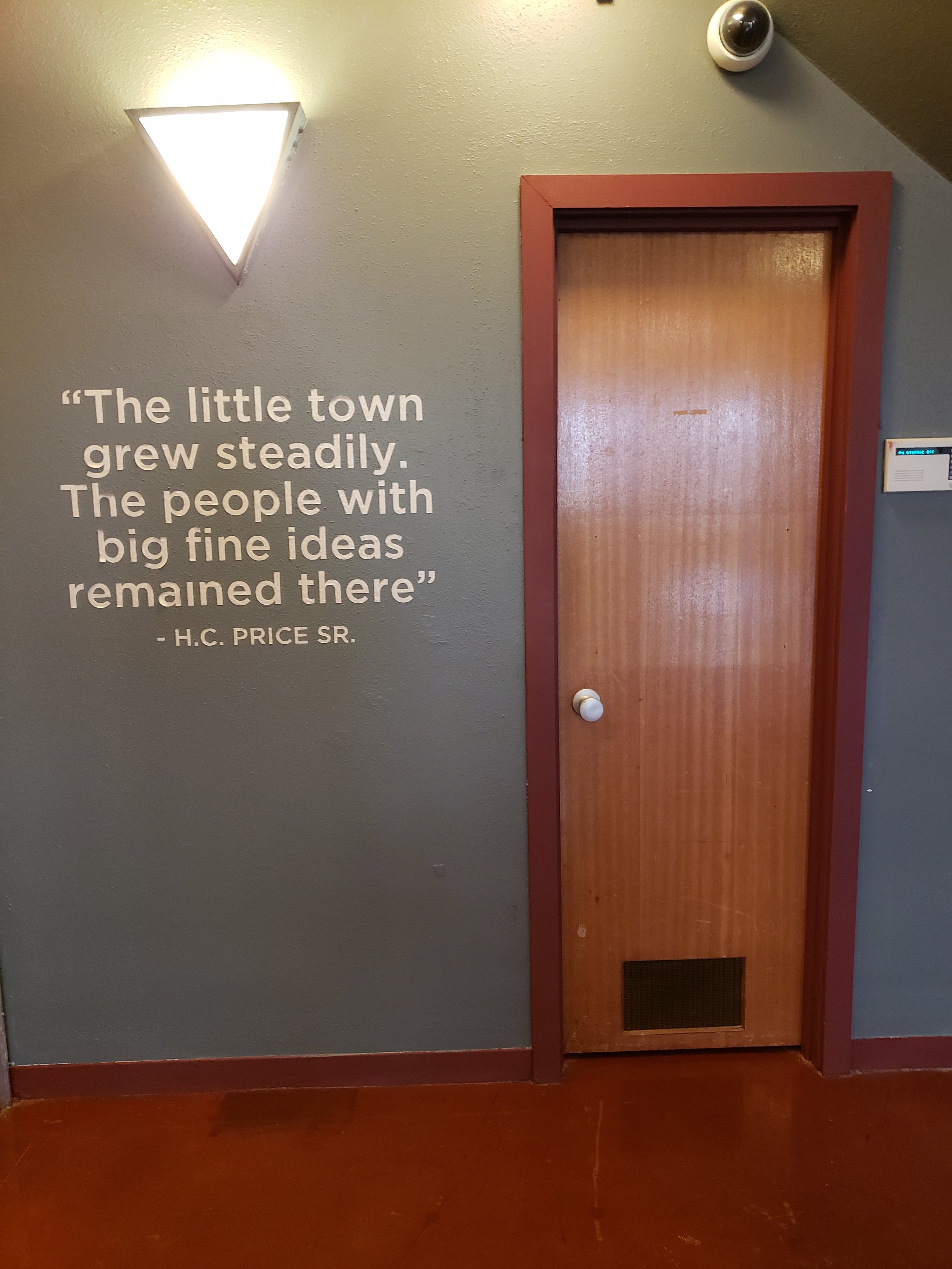 This 19 story building was designed with commercial, retail and residential spaces. Today the building still is multifunctional. It houses the Inn at Price Tower with beautiful modern hotel rooms. The building has art throughout beginning with a mural on the first floor.