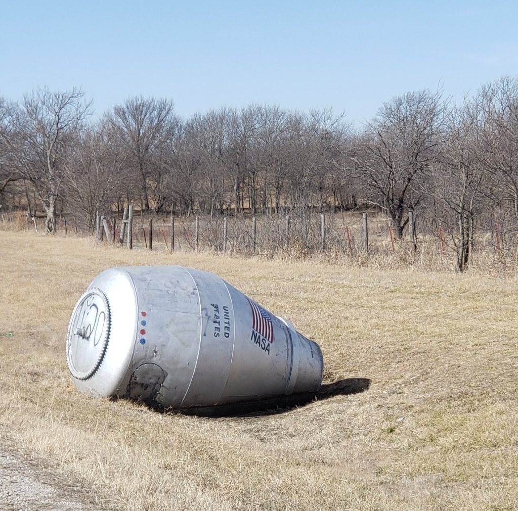 In 2011, local artists Barry and Heather Thomas decided to celebrate their 5th wedding anniversary by transforming the cement mixer into an object of wonder. They noticed its shape resembled that of a space capsule and began painting it to push the resemblance as far as possible. They covered it in silver paint and added NASA logos and an American flag.