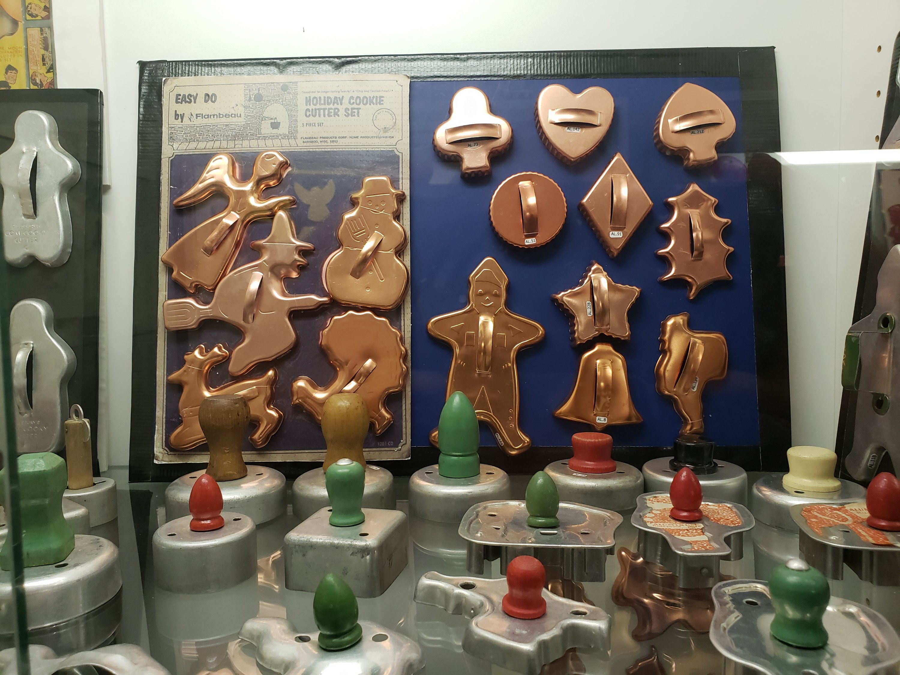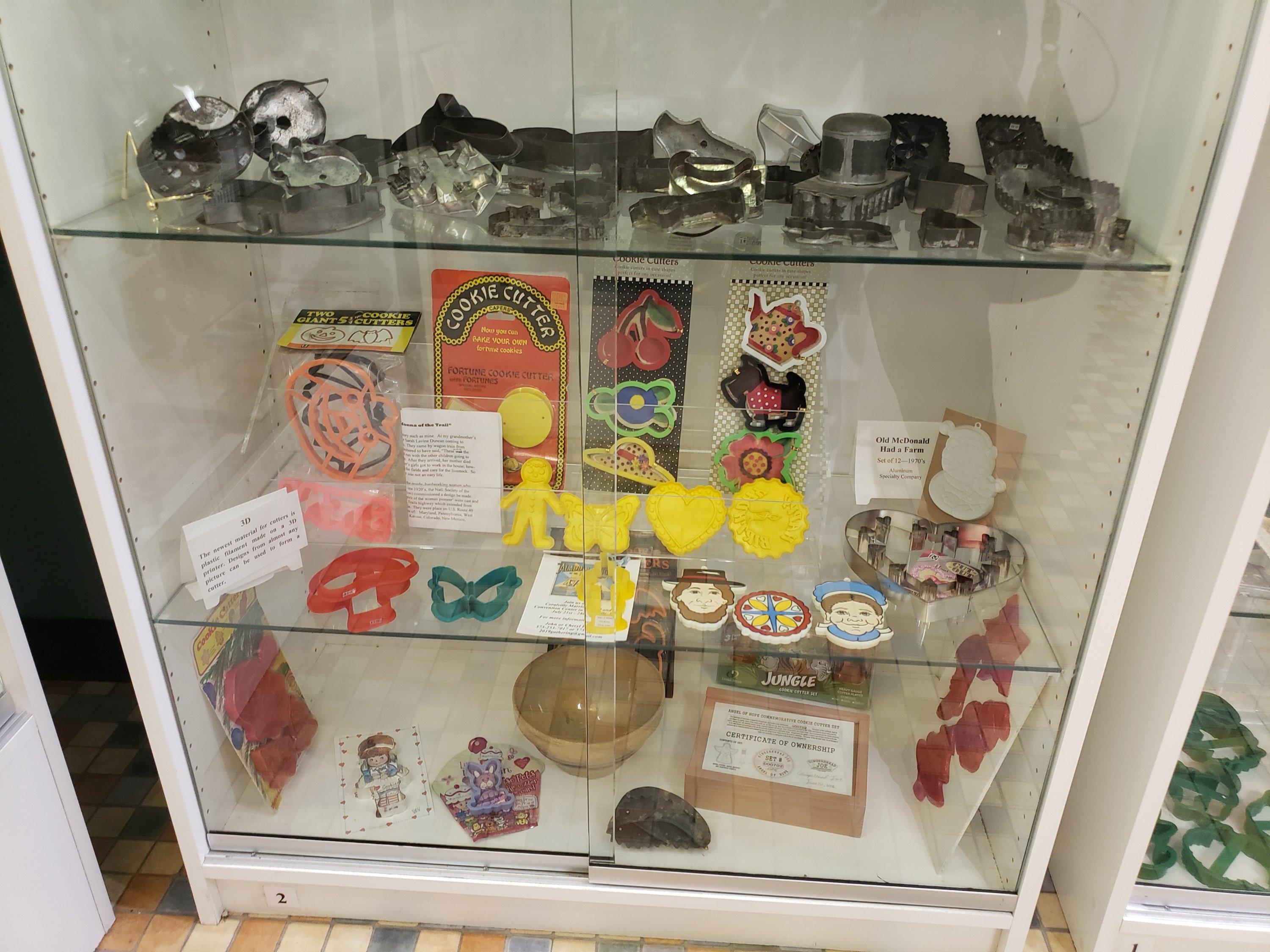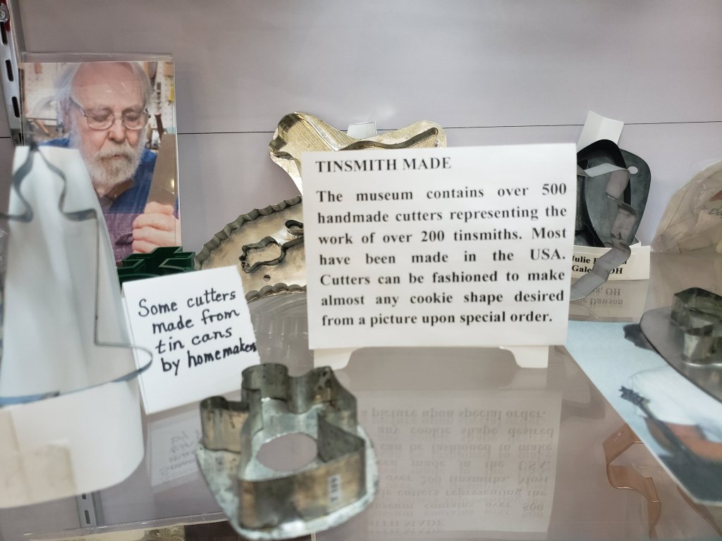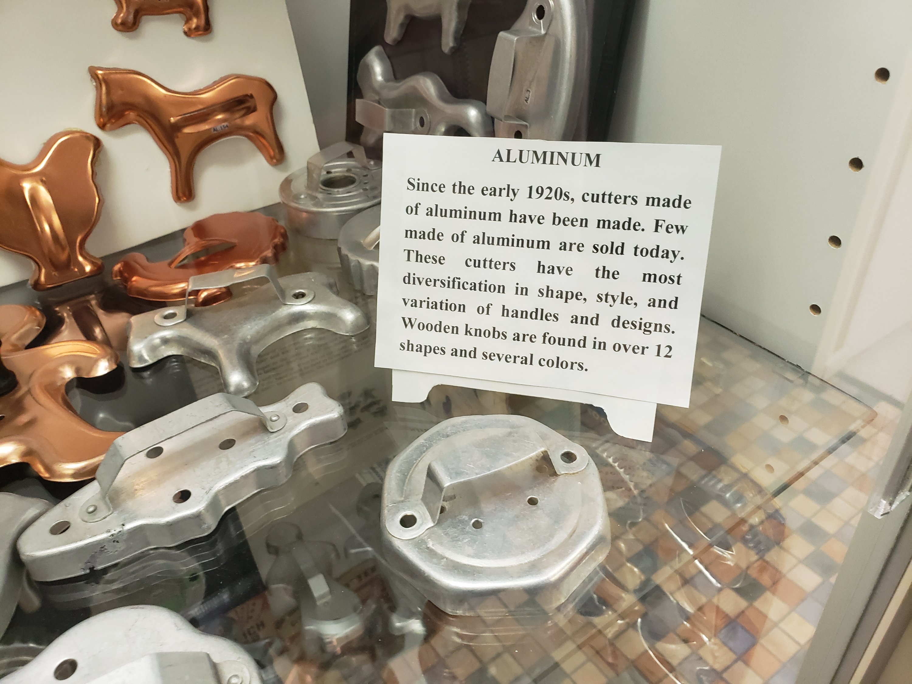 The Cookie Cutter Museum has a number of display cases, each containing a collection of different cutters. Some of those display advertising cutters, tinsmith’s cutters, European cutters and much more.
