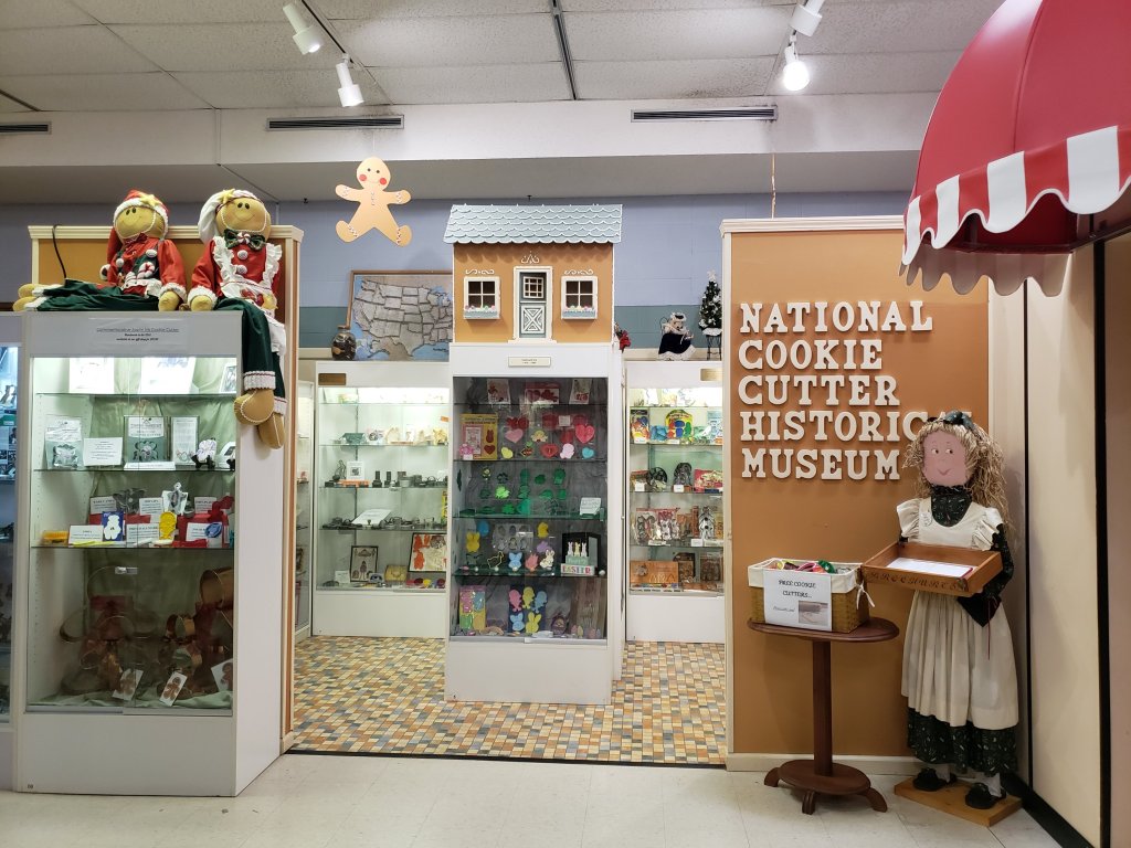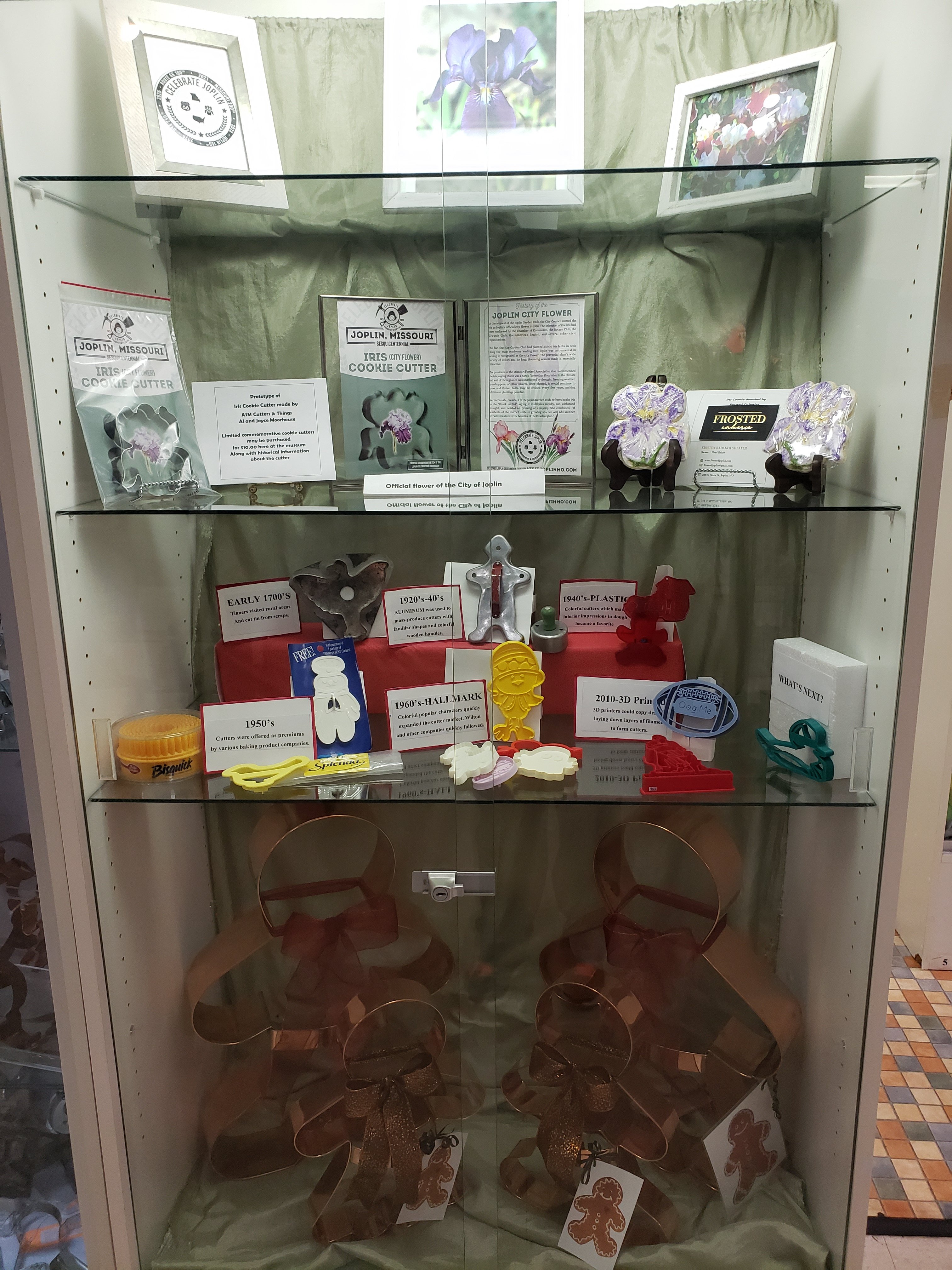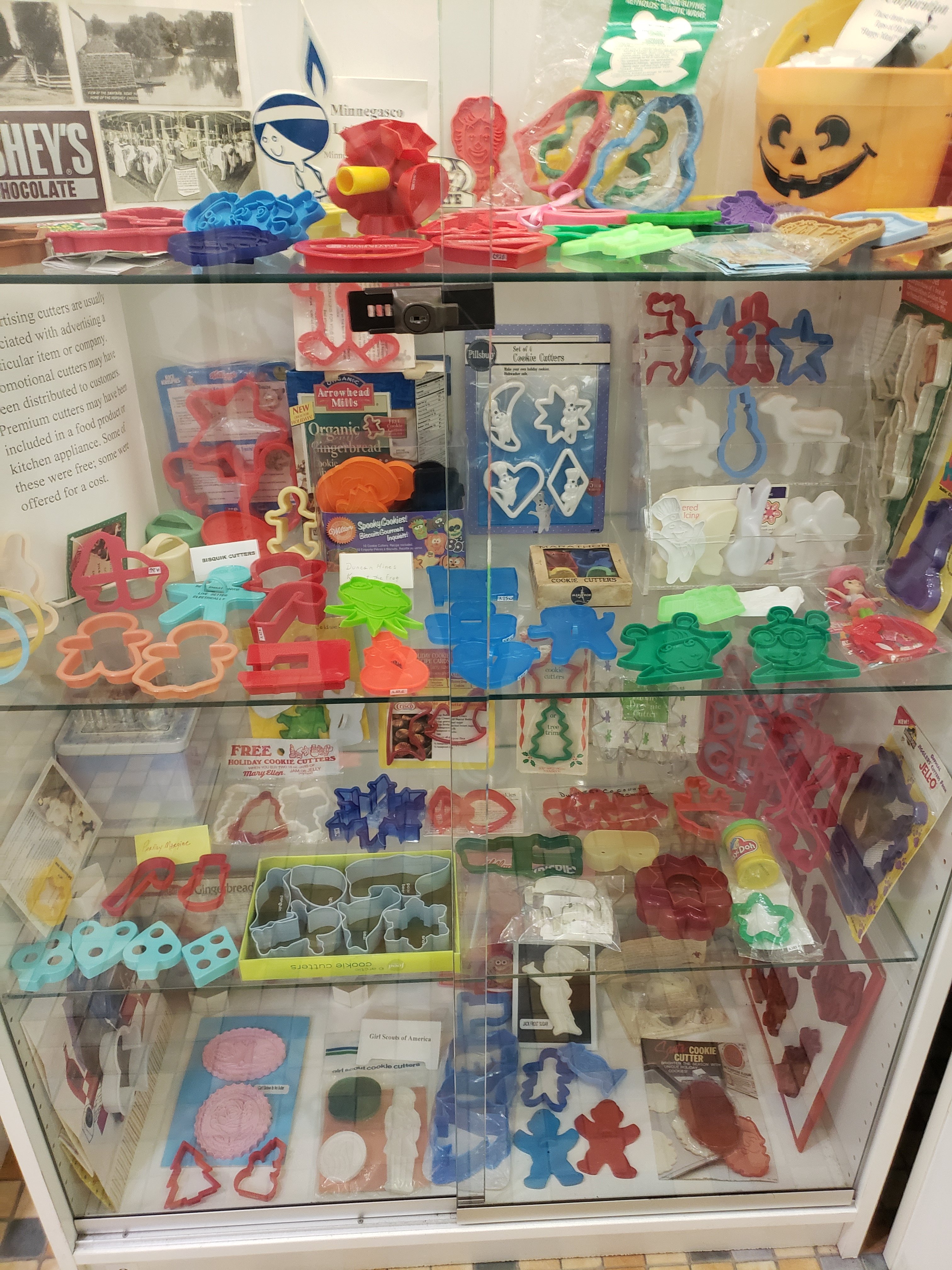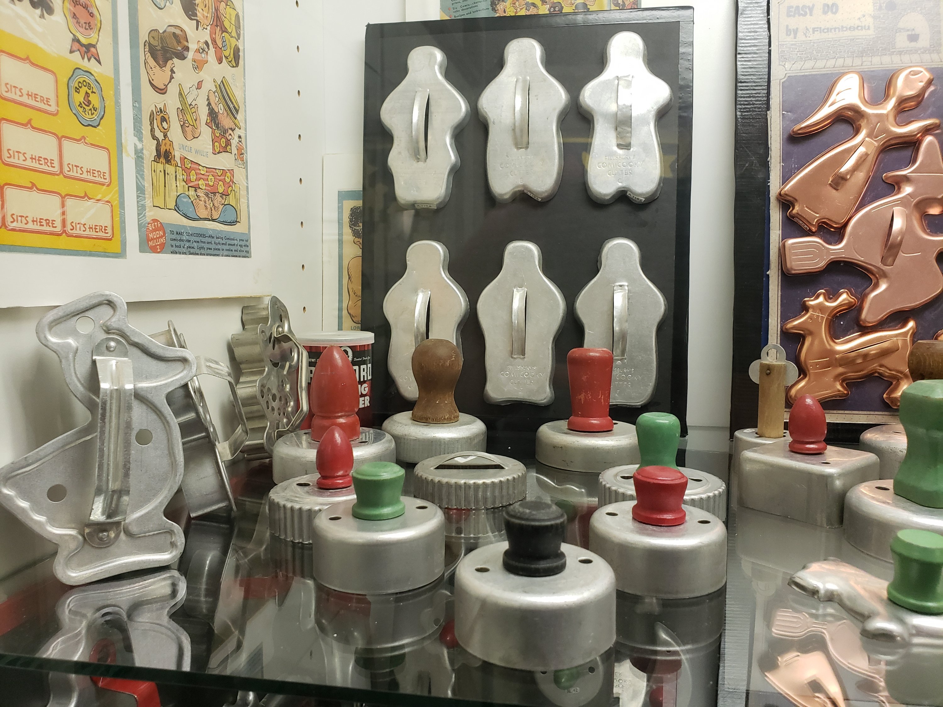 The Cookie Cutter Museum has a number of display cases, each containing a collection of different cutters. Some of those display advertising cutters, tinsmith’s cutters, European cutters and much more.