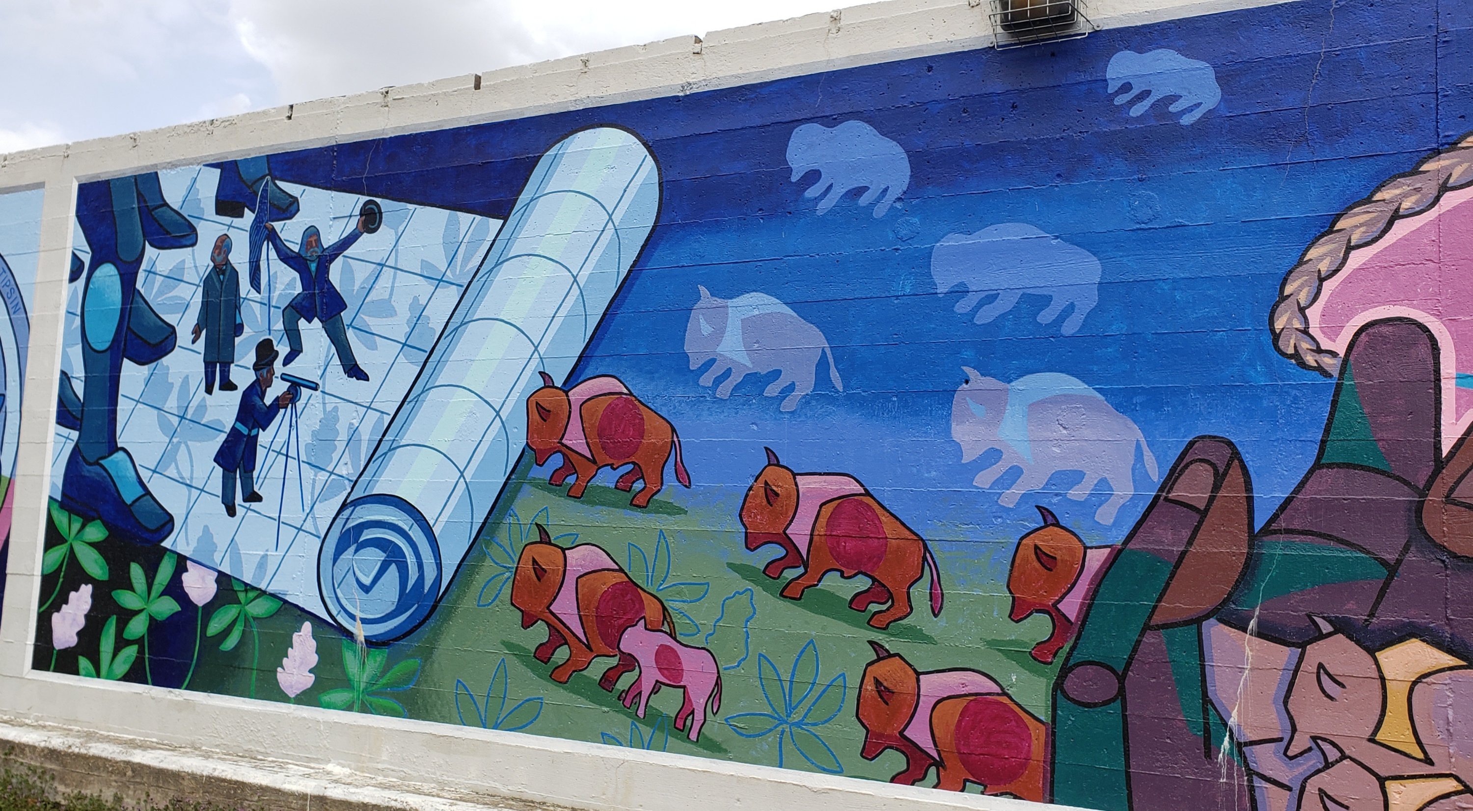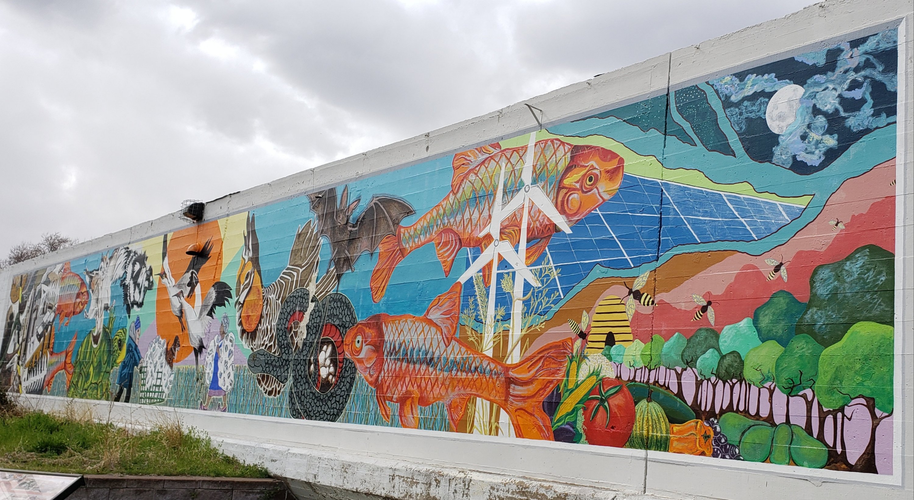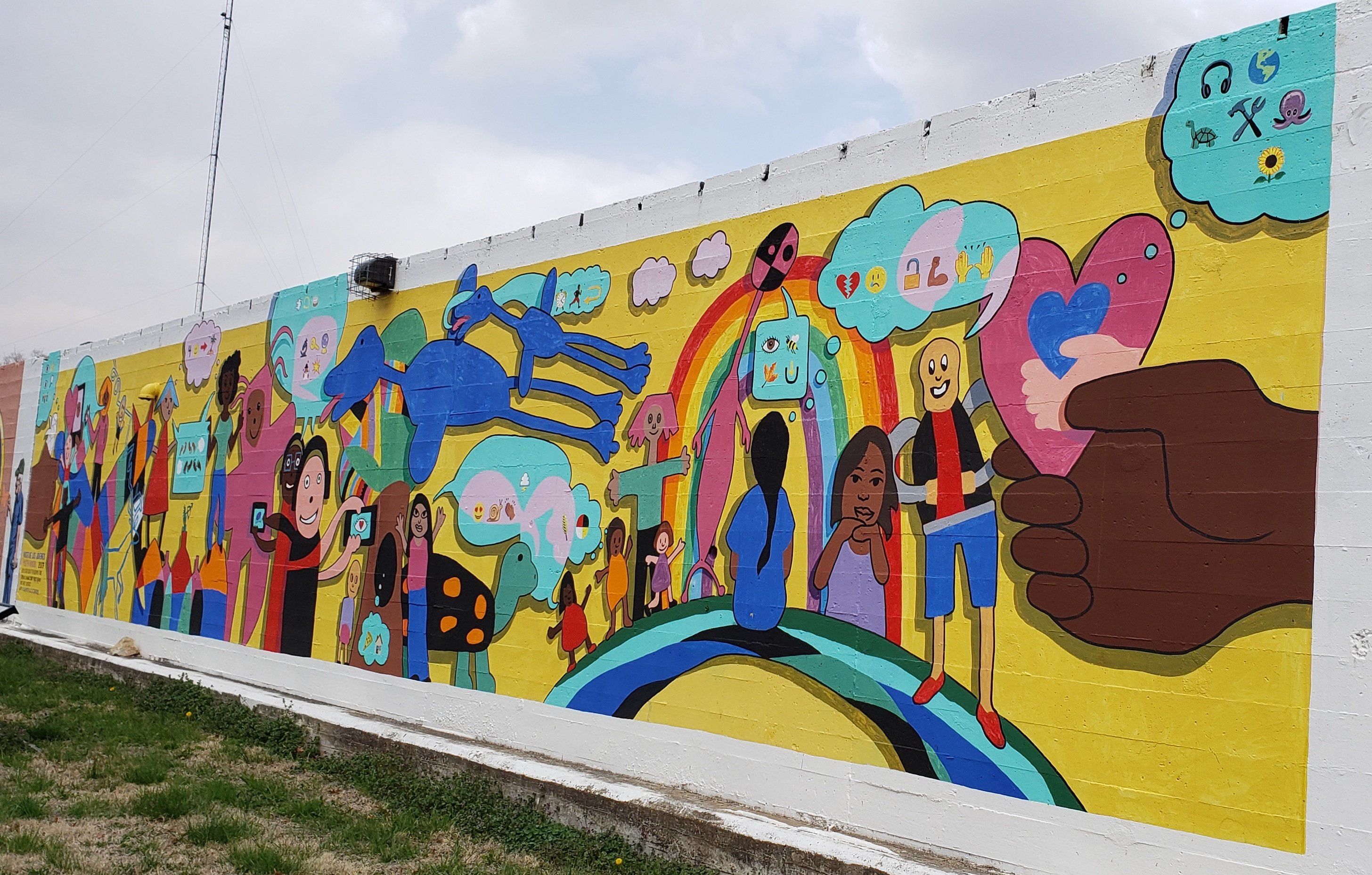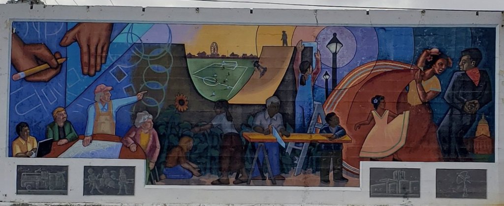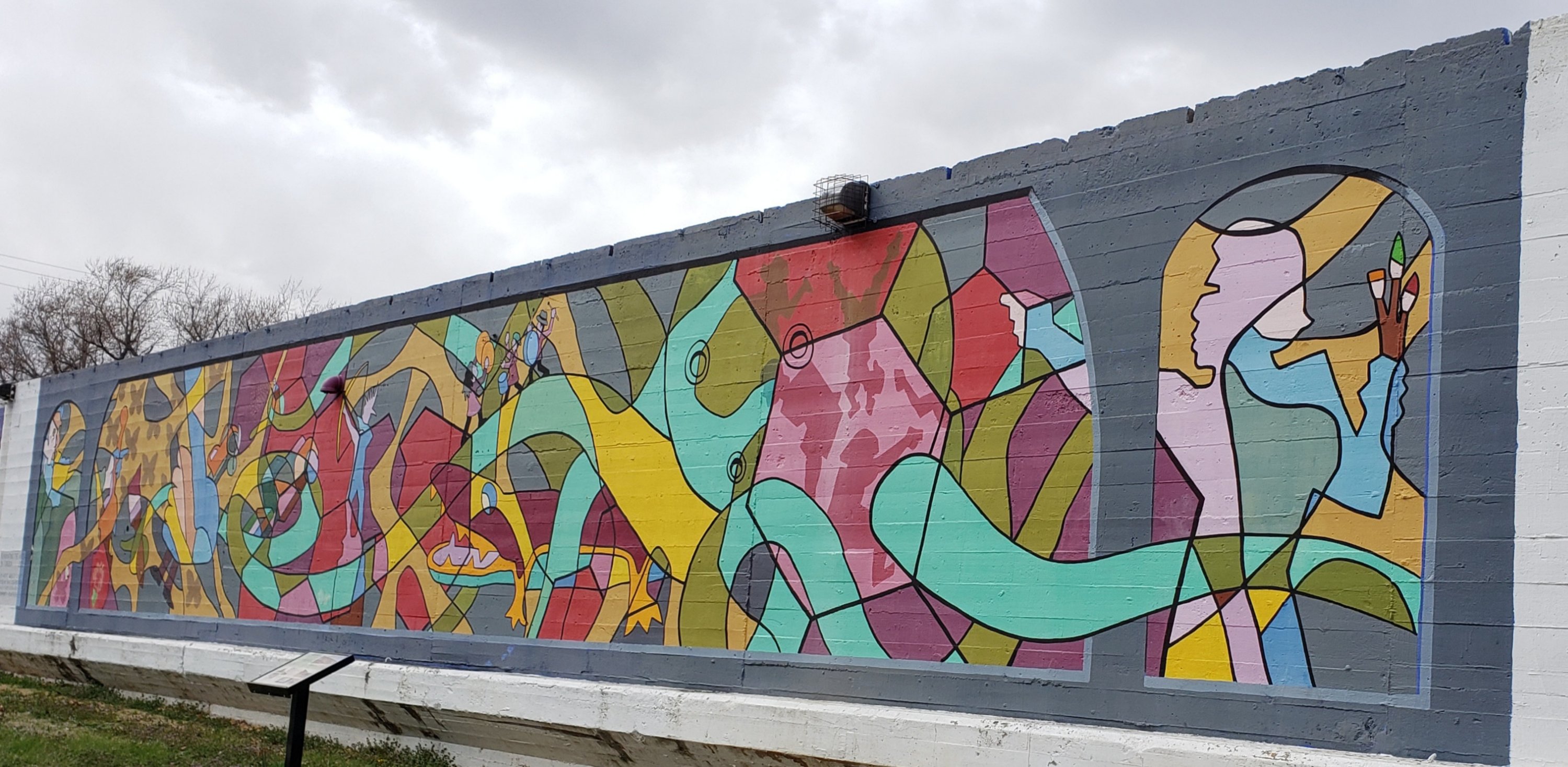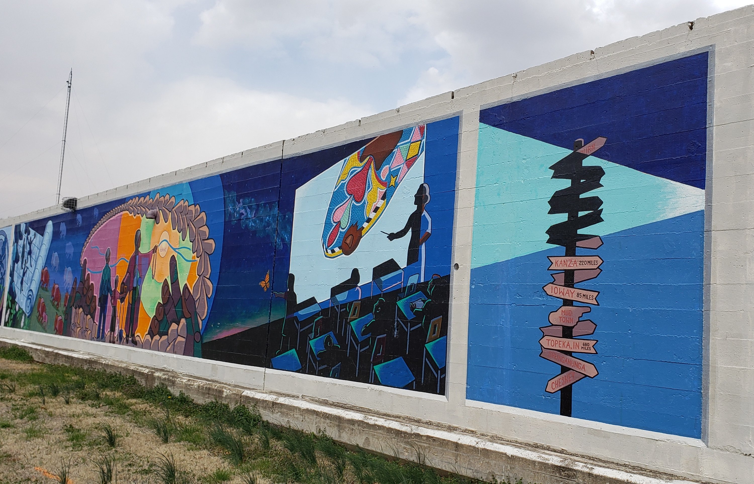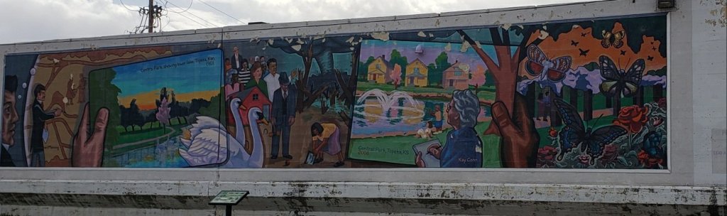 The Great Mural Wall of Topeka honors the cultural history and ongoing spirit of Topekans and their neighborhoods. The mural adorns a wall surrounding a former water reservoir, a building owned by the Topeka Water Division.