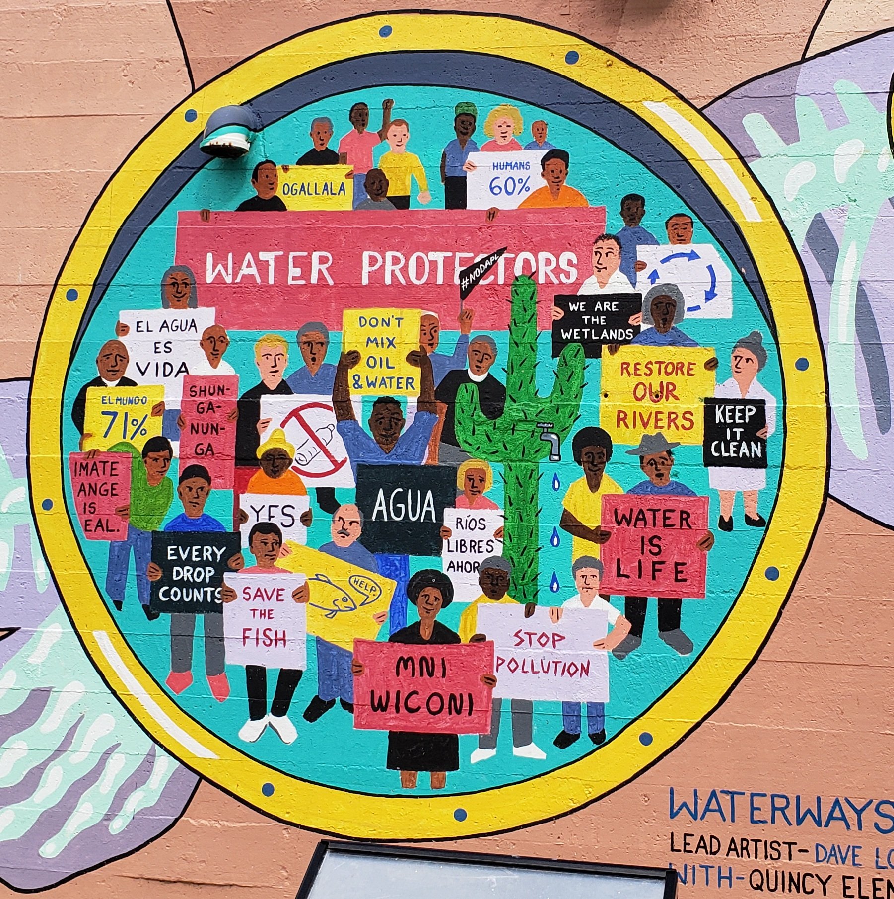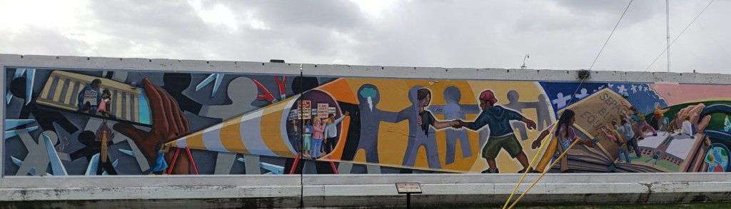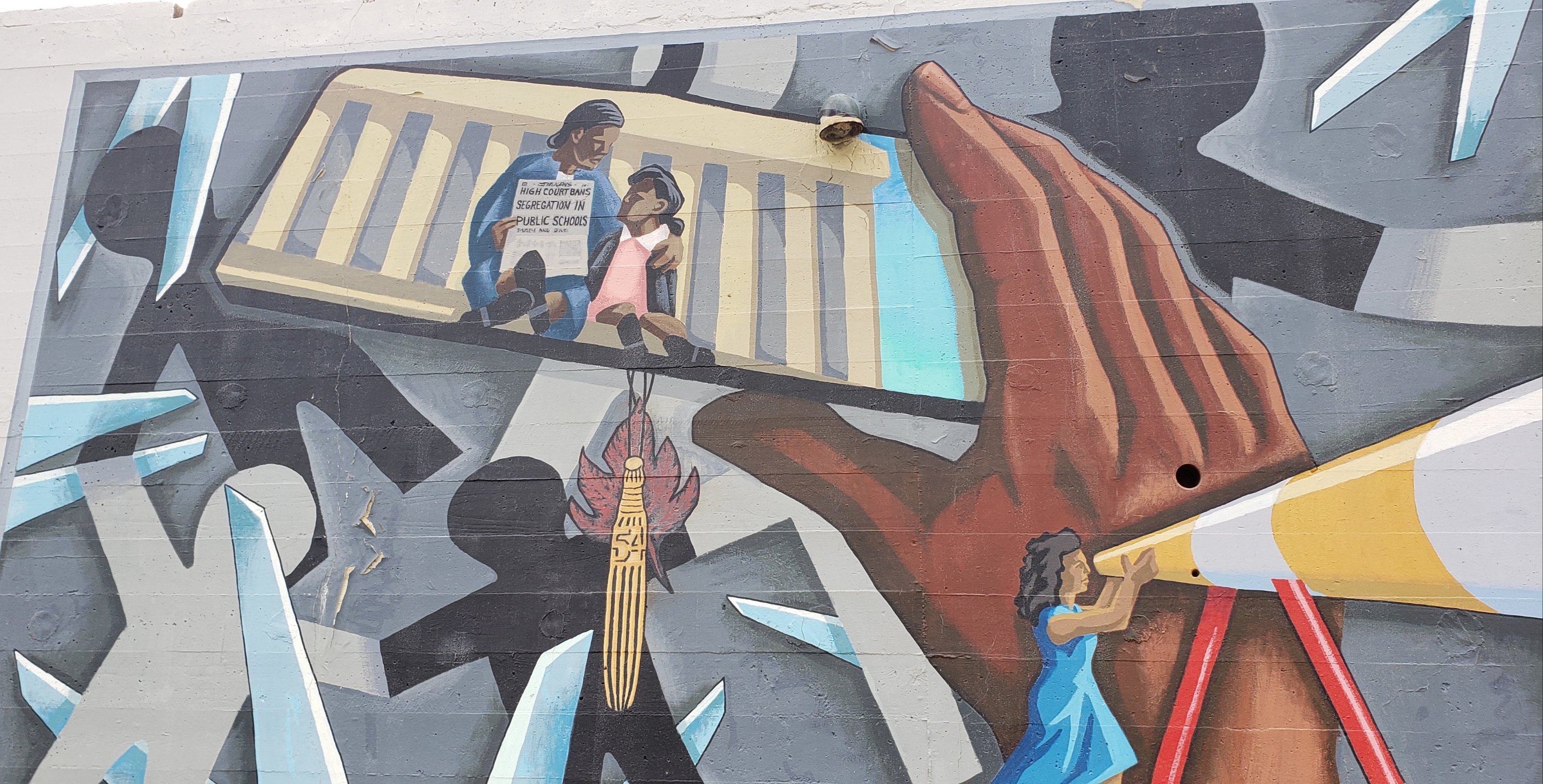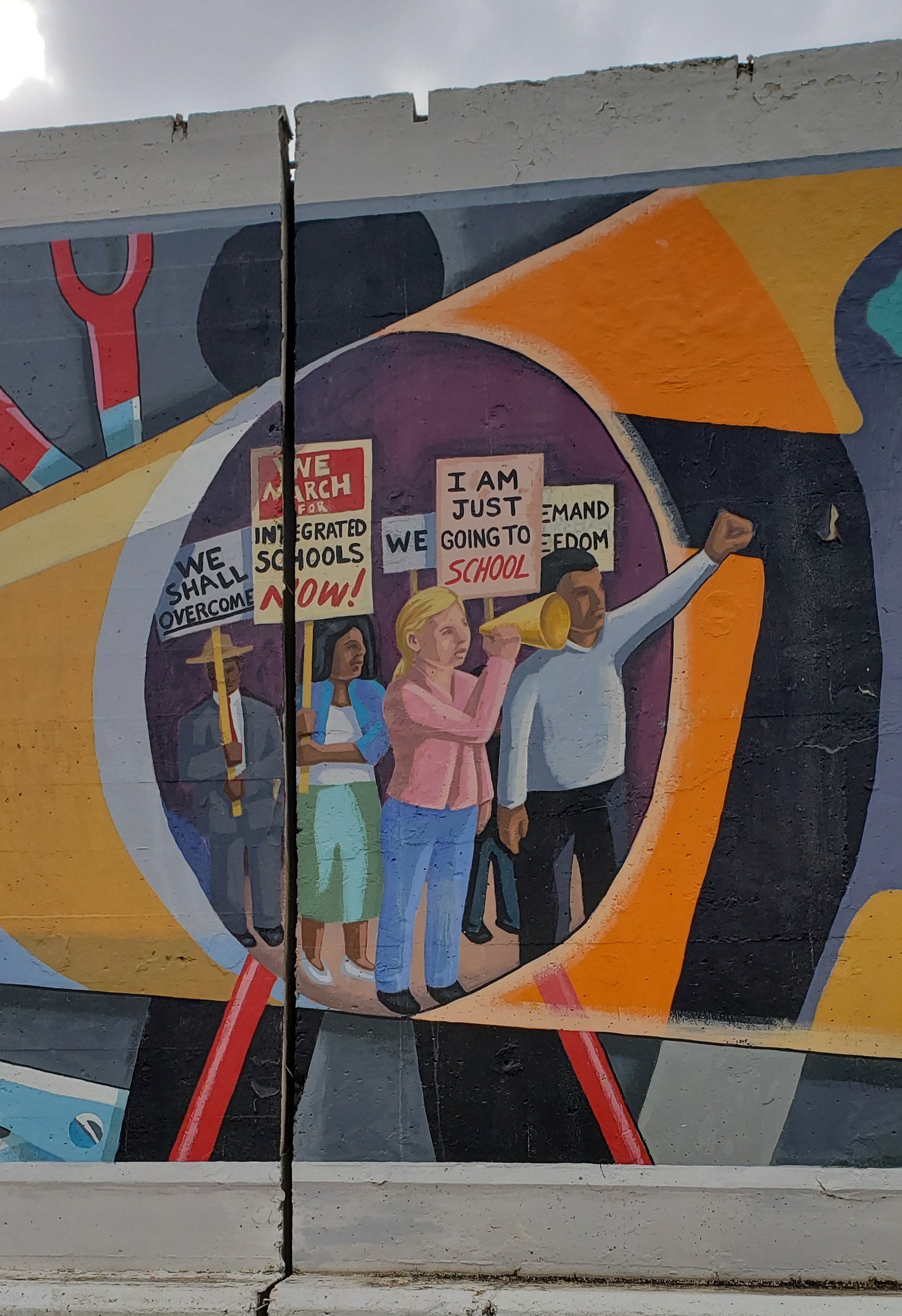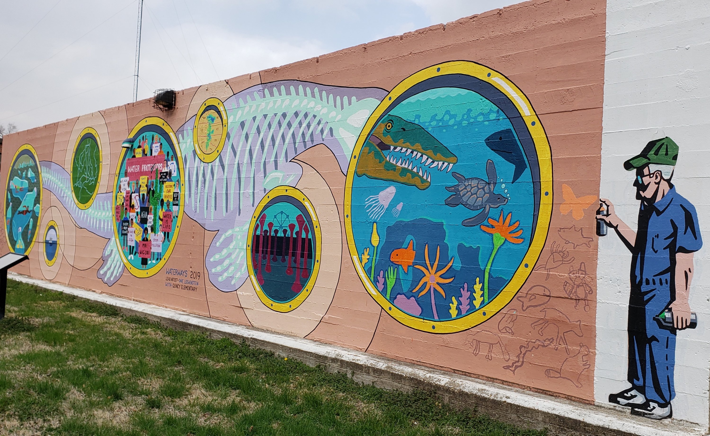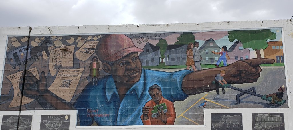 The Great Mural Wall of Topeka honors the cultural history and ongoing spirit of Topekans and their neighborhoods. The mural adorns a wall surrounding a former water reservoir, a building owned by the Topeka Water Division.