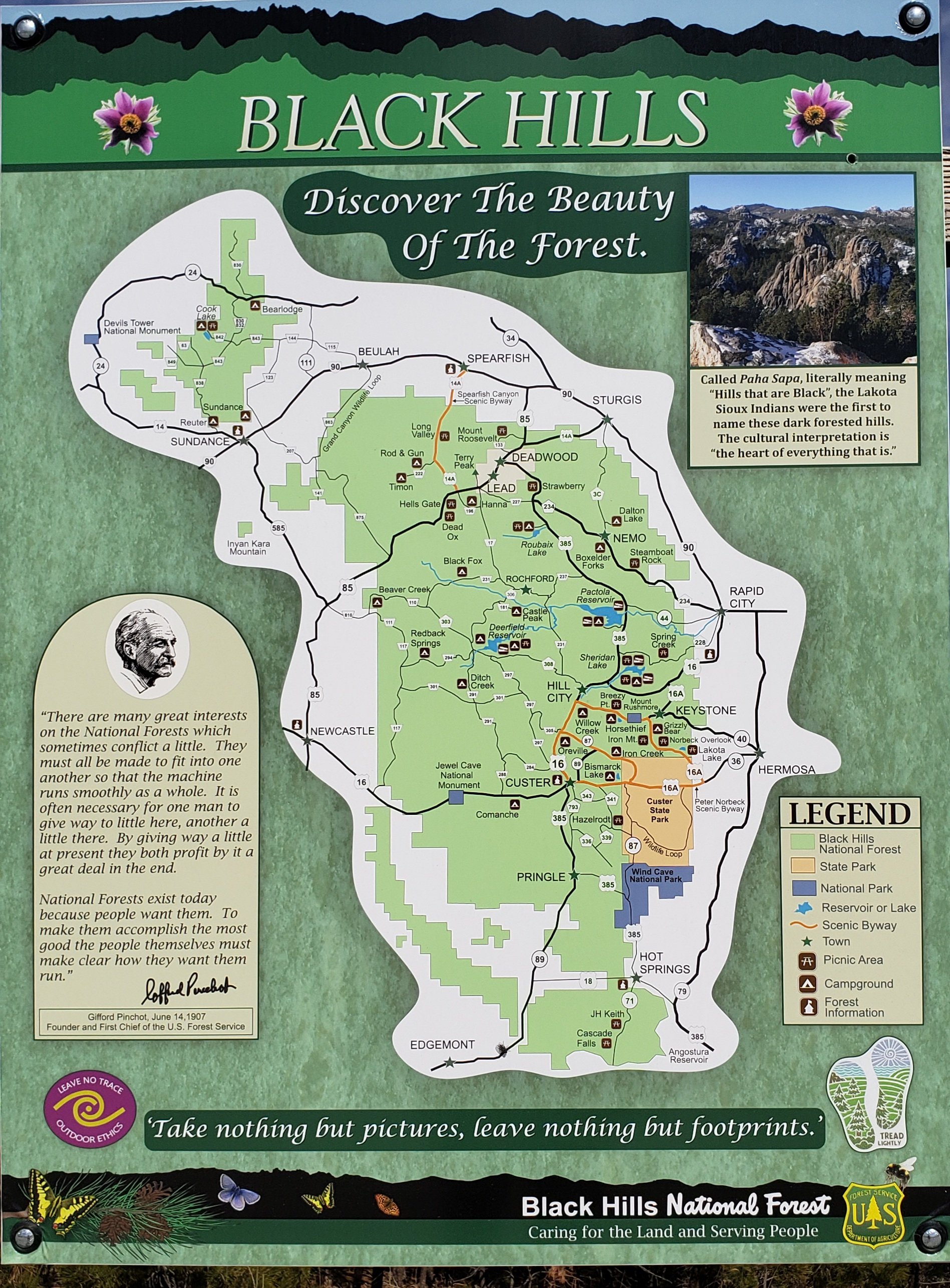The name “Black Hills” comes from the Lakota words Paha Sapa, which mean “hills that are black.” Seen from a distance, these pine-covered hills, rising several thousand feet above the surrounding prairie, appear black.
